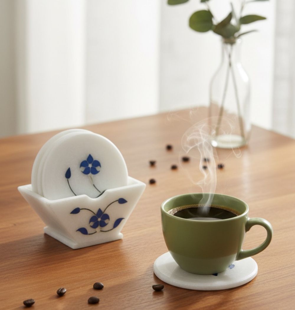 Discover the artistry of India with our stunning Soapstone Coaster Set of 6. Each coaster is meticulously crafted with intricate inlay work. The natural warmth of soapstone combined with the vibrant colors of the inlay creates a captivating piece that adds a touch of elegance to any table. It includes 6 elegant coasters and a matching coaster stand, perfect for keeping your living space organized.
