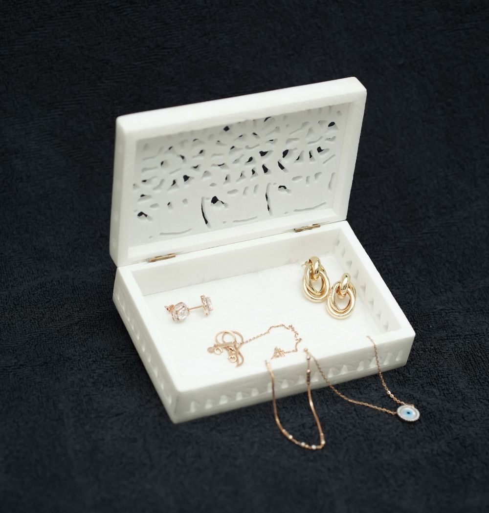 Inspired by the Jalis from palaces in Rajasthan, discover the masterpiece of craftsmanship with our Soapstone Jali storage box. The intricate, hand-carved jali pattern creates a mesmerizing interplay of light and shadow. This versatile box is perfect for storing jewellery, trinkets, or as a decorative accent.